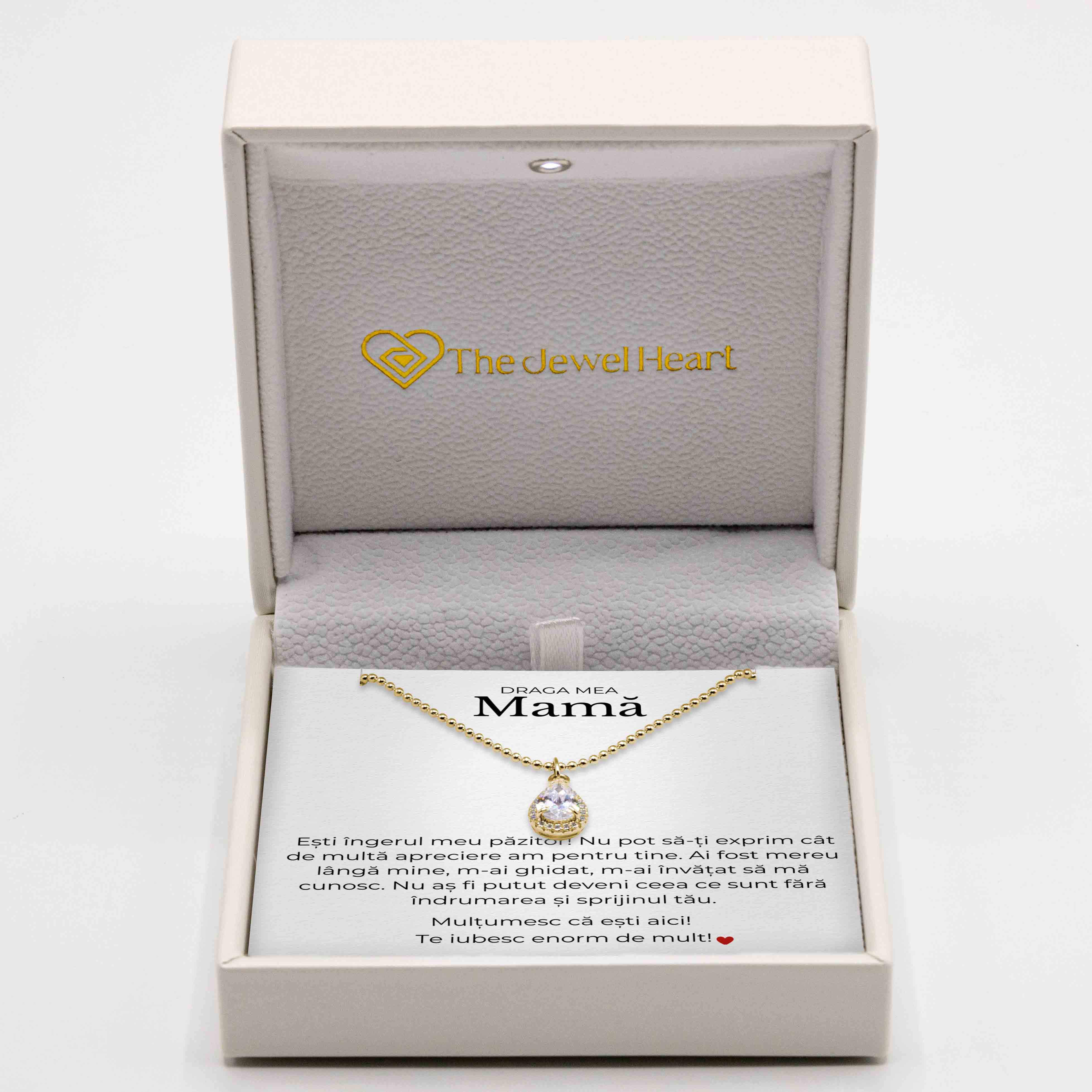 Este mai mult decât un simplu accesoriu, este un semn al iubirii și aprecierea ta față de persoana care te-a adus pe lume. Cu un design sofisticat, acest colier integrază cristale de zirconiu strălucitoare care sărbatorește frumusețea și infinitul iubirii materne. Fiecare detaliu este atent lucrat, folosind argint 925, și placat cu aur de 14K pentru un aspect luxos și durabil.